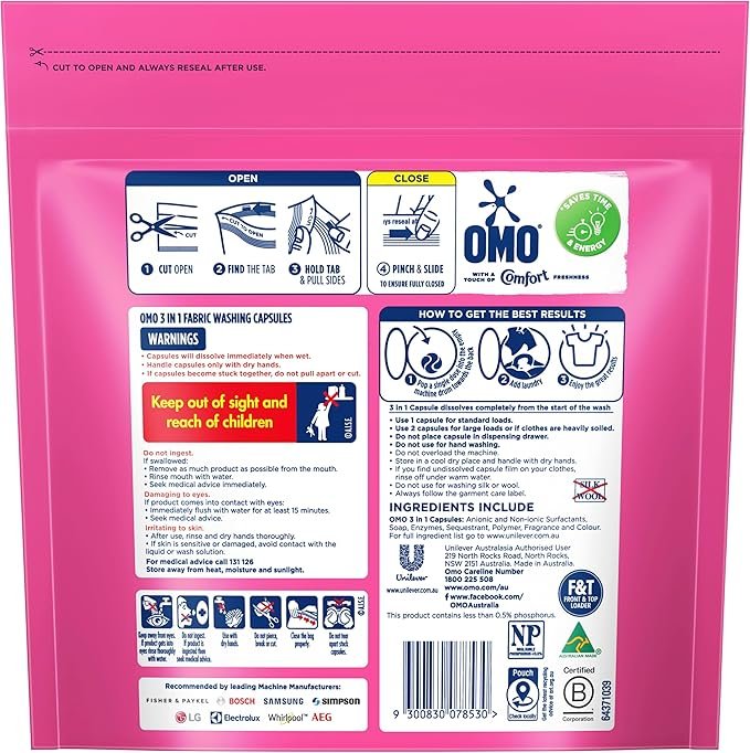 OMO 3-in-1 Laundry Capsules are tough on stains with a touch of Comfort-inspired freshness OMO Touch of Comfort 3-in-1 Laundry Capsules provide a brilliant clean first time and every time, attacking stains even in quick and cold washes.